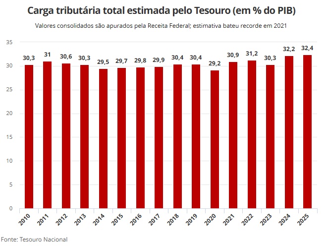 Se a estimativa se confirmar, a carga tributária em 2025 terá sido a maior da série histórica iniciada em 2011, ou seja, um recorde. O número oficial é divulgado pela Receita no final de 2026.